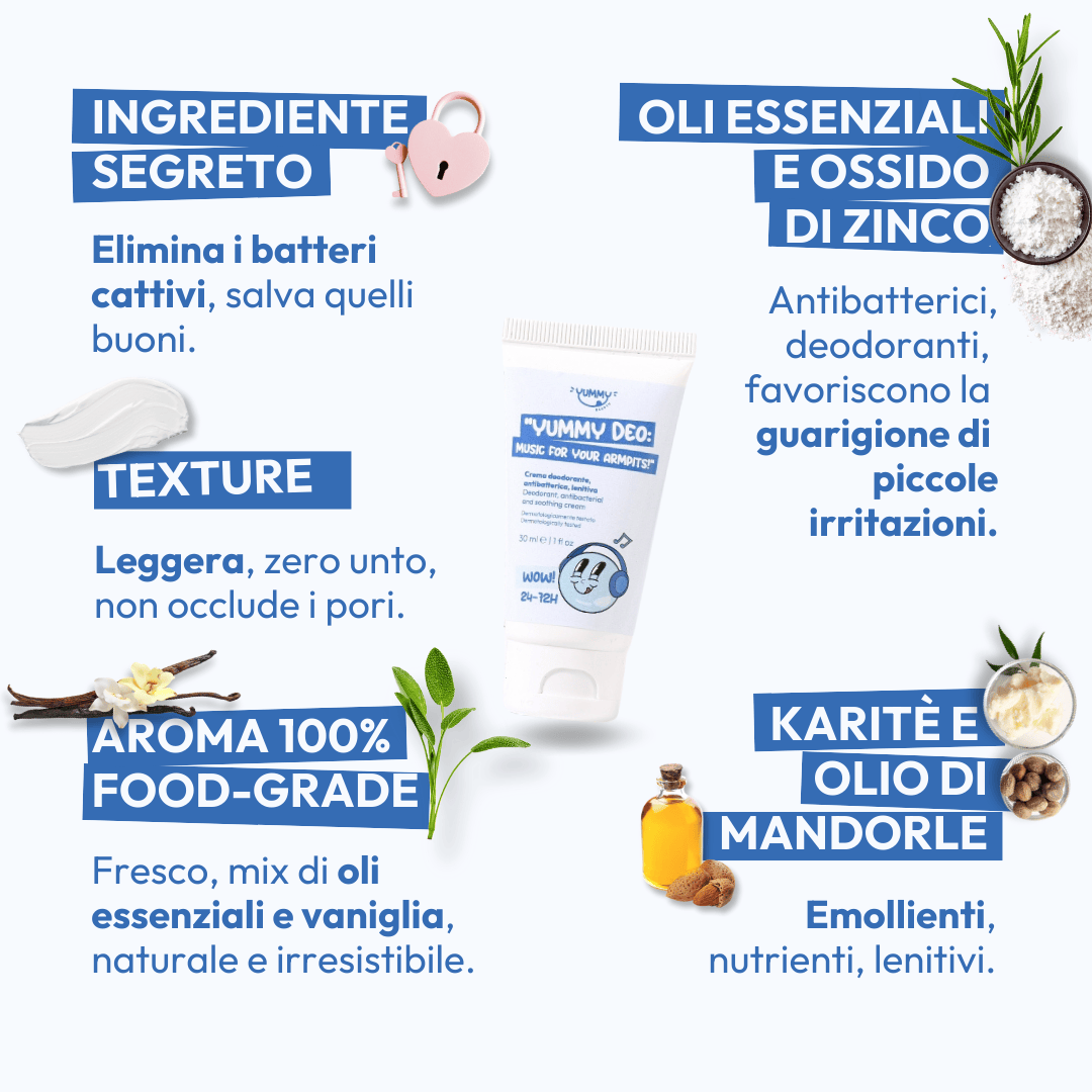 Sono il vero deodorante in grado di uccidere i batteri responsabili del cattivo odore e salvare quelli buoni, ricreando il corretto microbioma cutaneo, senza creare irritazioni. Sono perfetto dopo rasoio o ceretta, grazie al mio potere lenitivo e traspirante, inoltre sono efficace anche durante periodi di stress, ansia o ciclo intimo! 24h WOW garantite, fino ad oltre 72h. Duro 7-9 settimane! Cosa aspetti? È ora di far partire la musica!